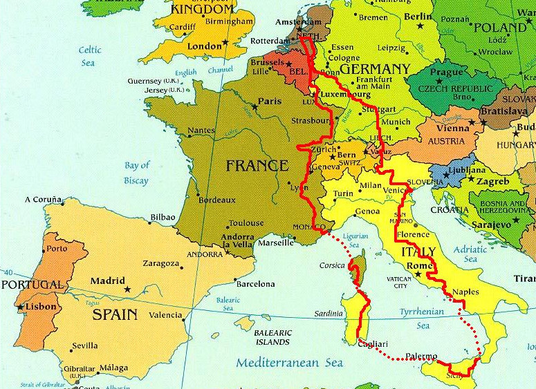 Europe on two wheels - A cycling trip through EuropeHolland - Germany - Austria - Italy - Sicily - Sardinia - Corsica - France - Belgium - Holland |